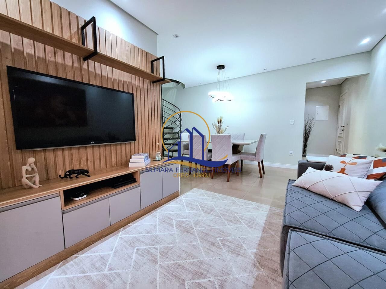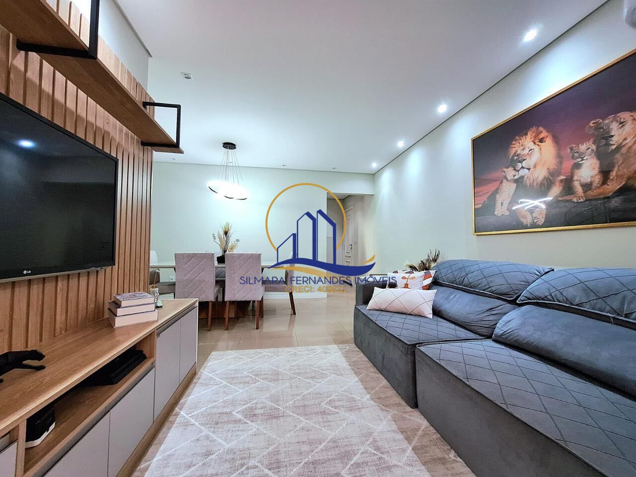 Salas integradas (estar, jantar e tv), climatizada, painel planejado