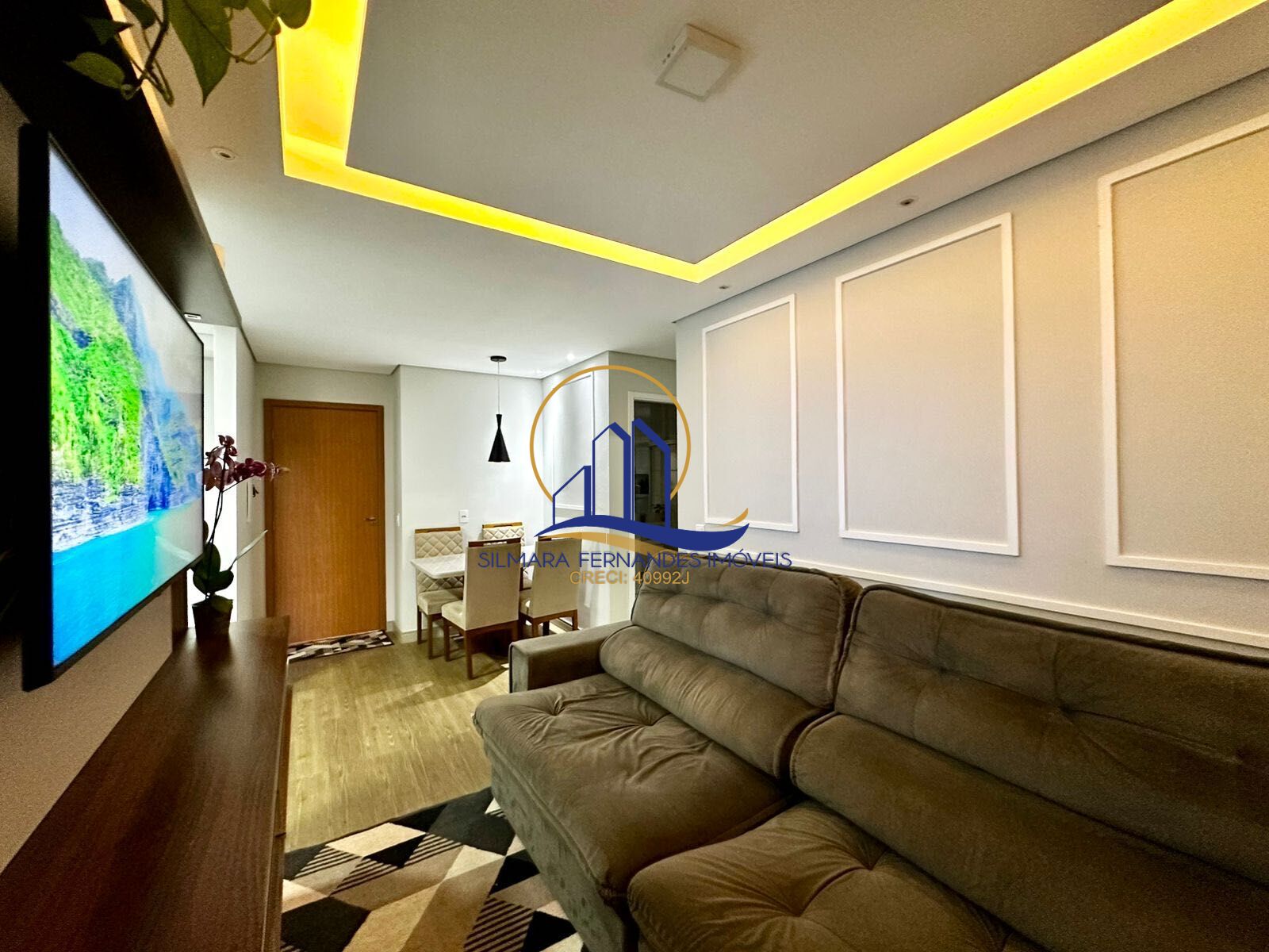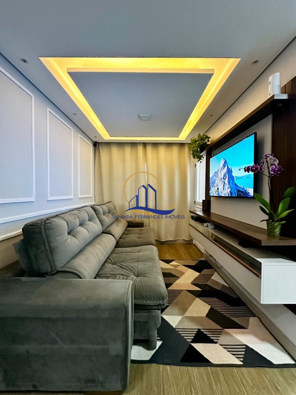 Sala de estar com boiserie, teto rebaixado com iluminação
