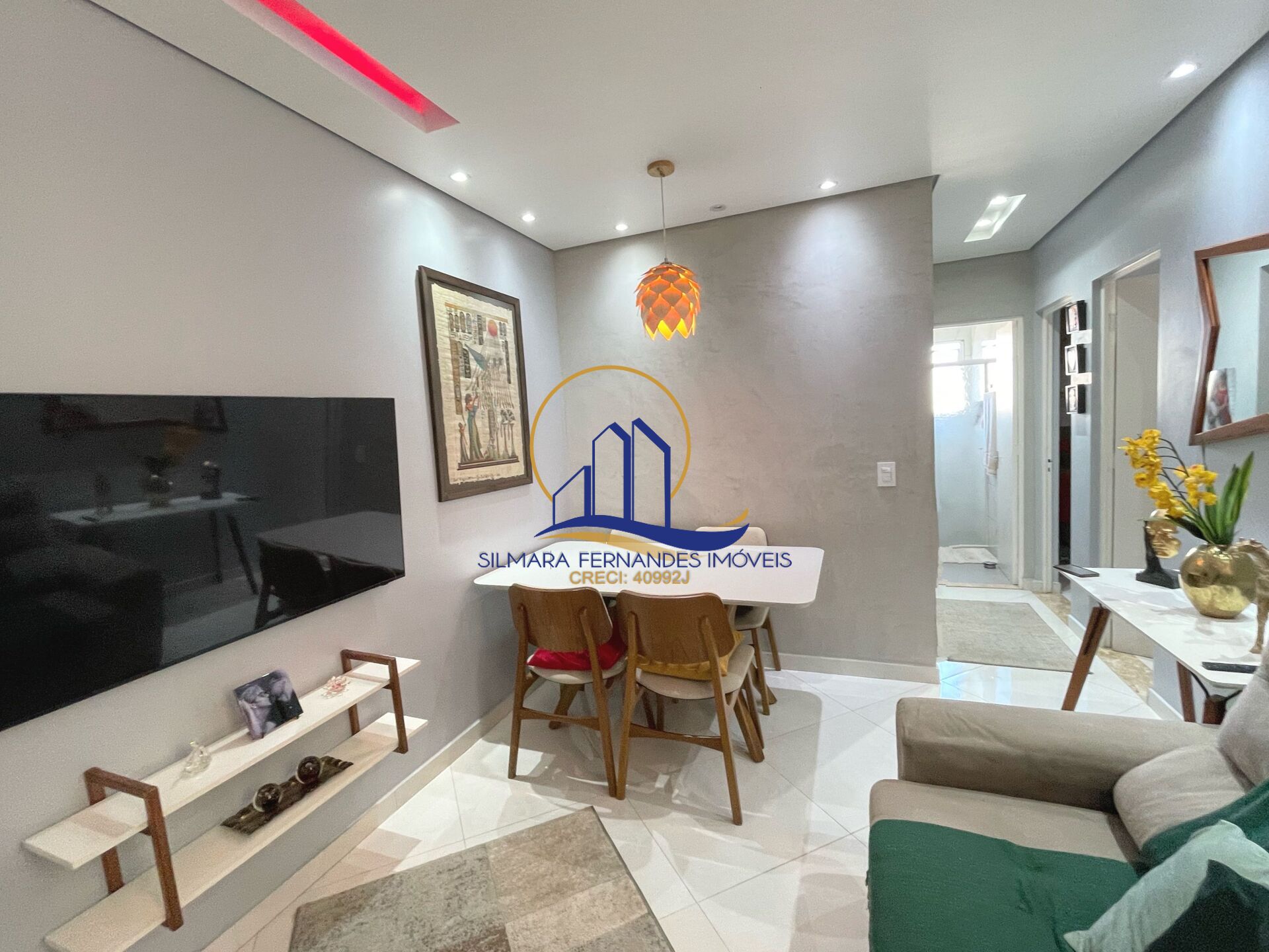 - Sala aconchegante com lustre, teto tabicado em gesso, parede personalizada, iluminacao em LED