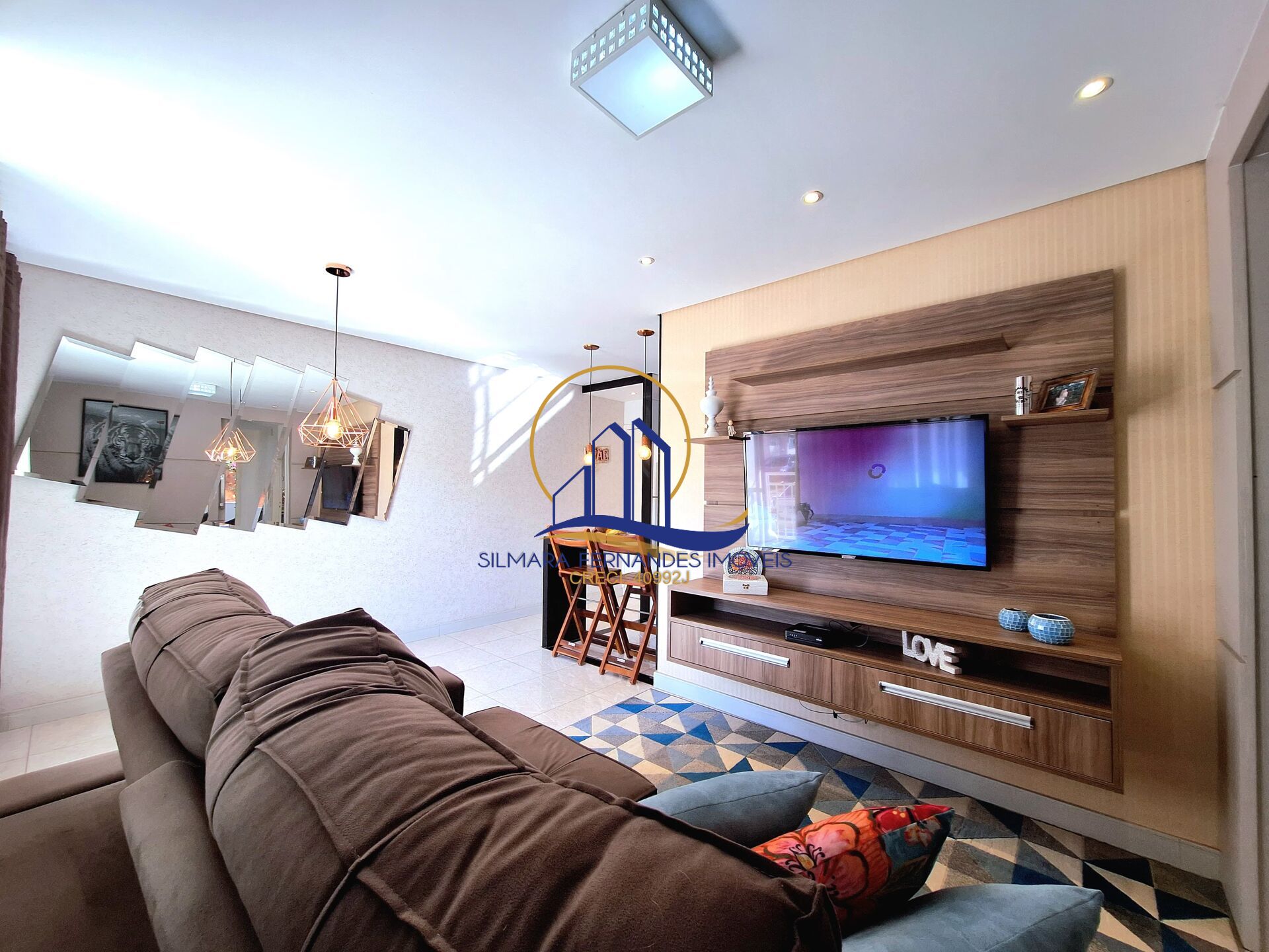 Sala de estar e jantar integradas, luminária, painel de TV/ rack e papel de parede