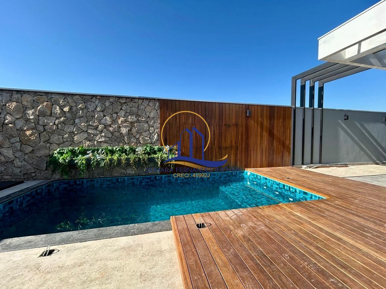 Piscina com cascata de parede (possui infra para aquecimento)Área externa com pergolado metálico
