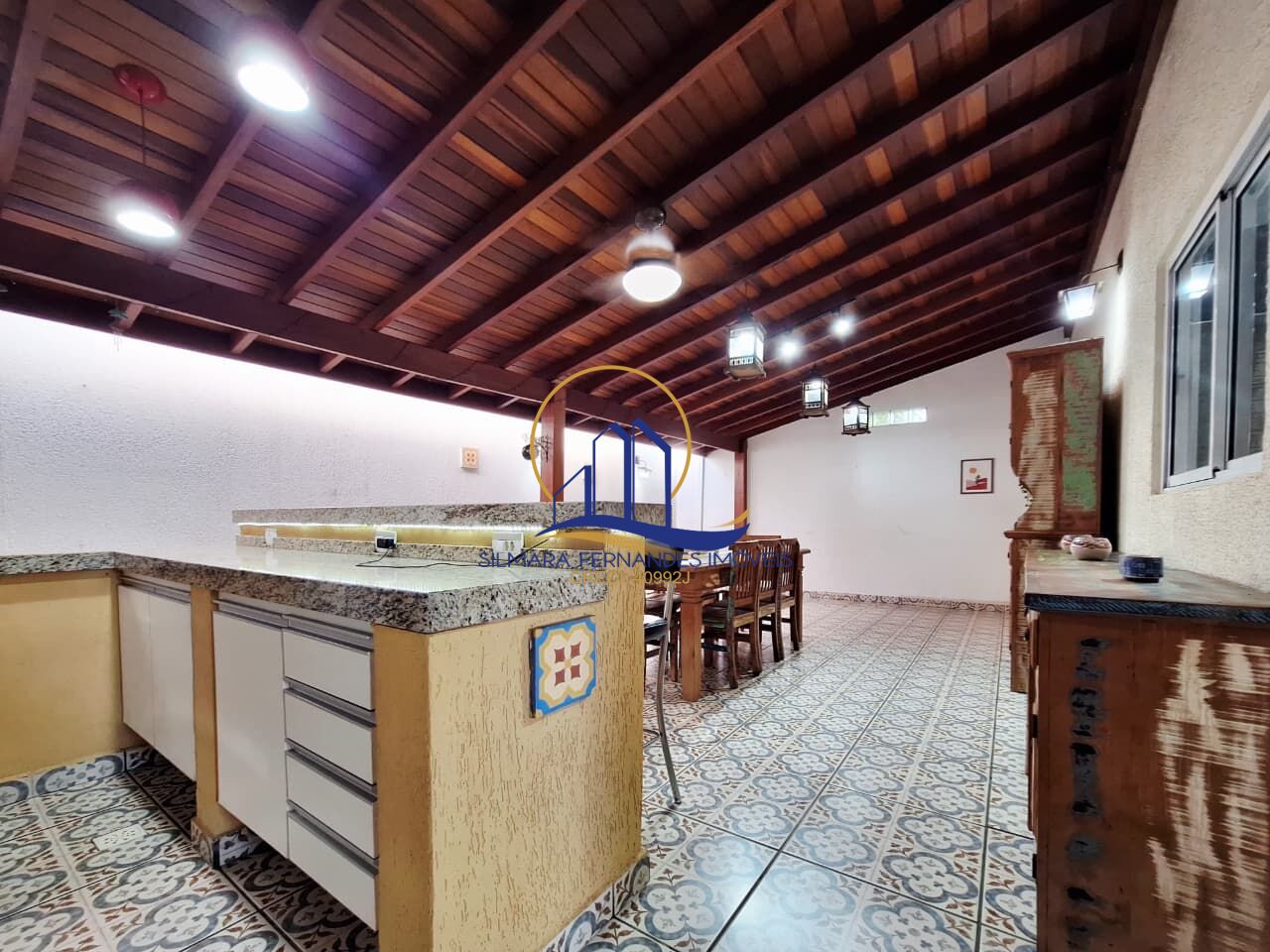 Área gourmet linda com churrasqueira, bancadas espaçosas com gabinetes, ventilador, luminárias