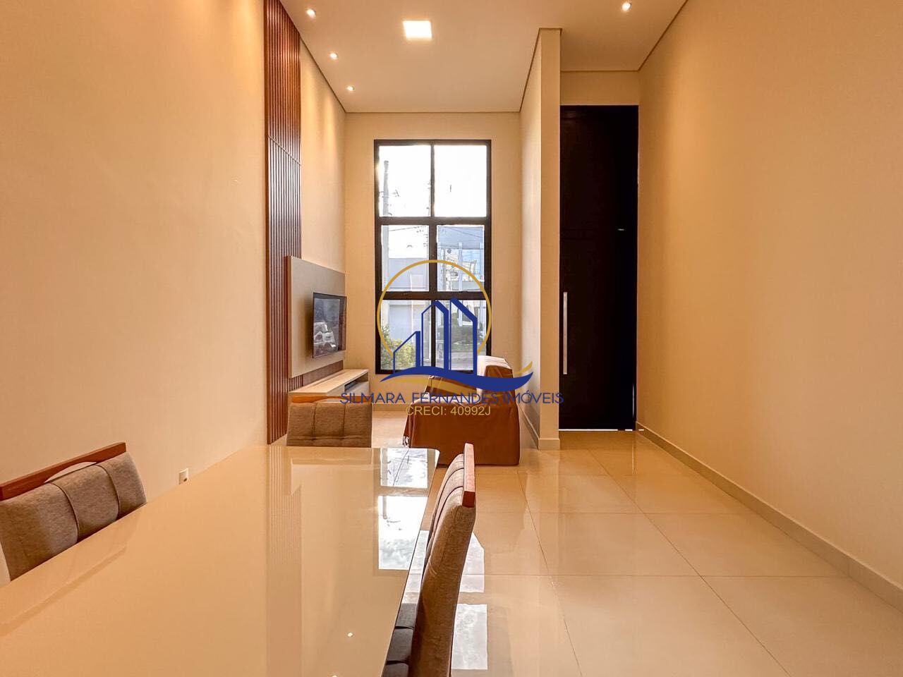 Sala de estar e jantar integradas, pé direito duplo, janela basculante, painel de TV e ar condicionado.