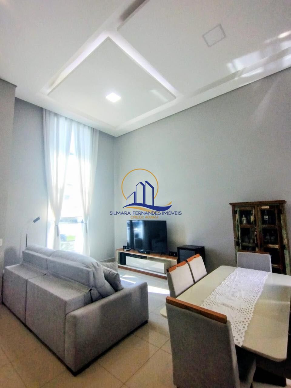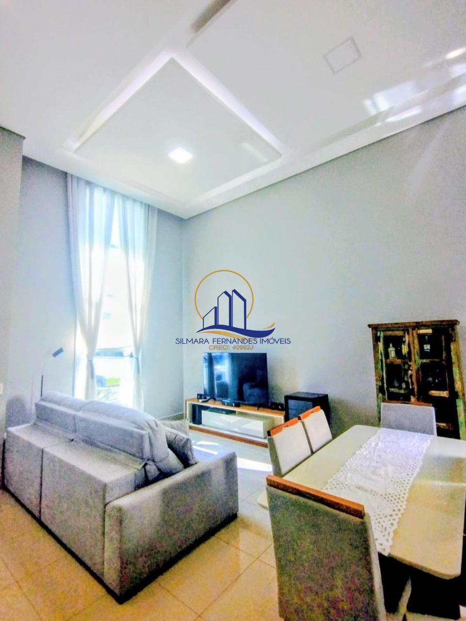 Sala de estar e jantar climatizadas, pé-direito duplo, rack de TV e cortinas