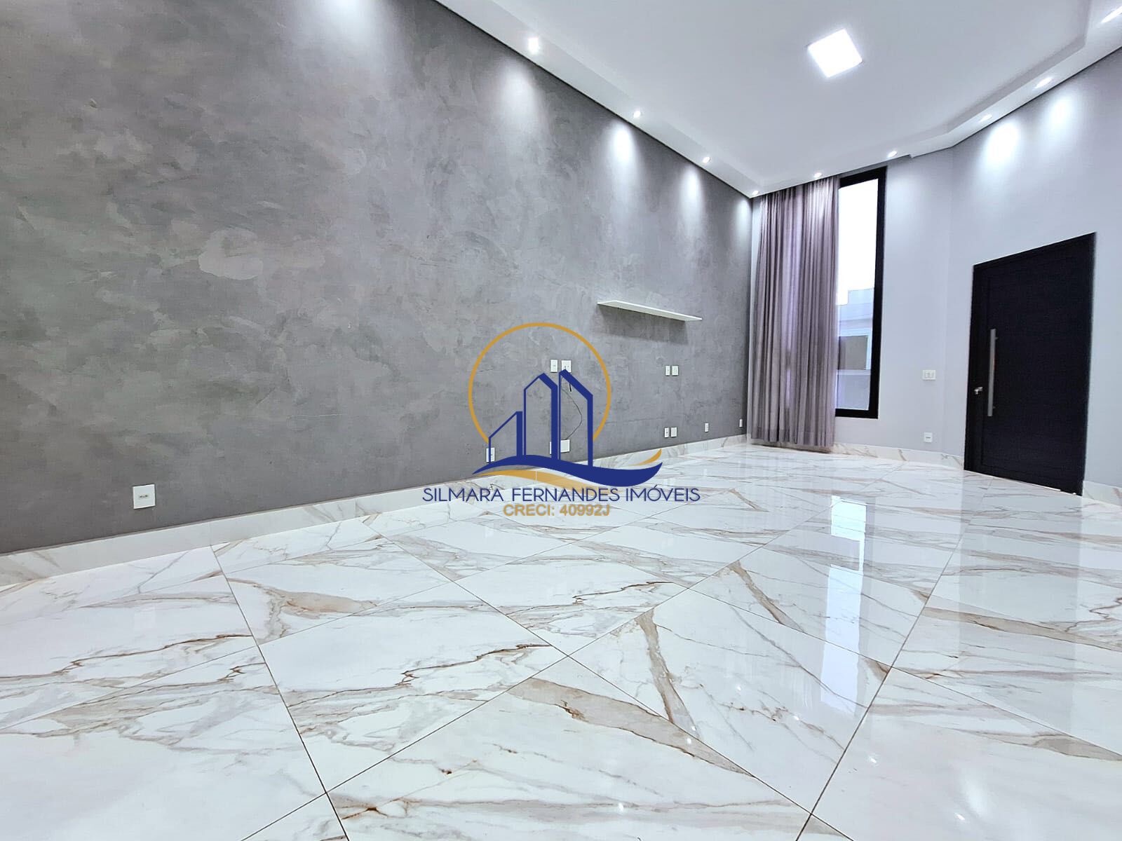 Sala de estar e jantar integradas, pé direito alto, cortina, parede com cimento queimado, infraestrutura para ar condicionado