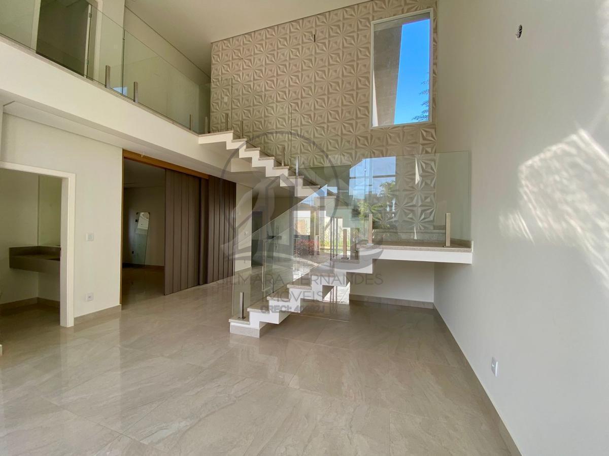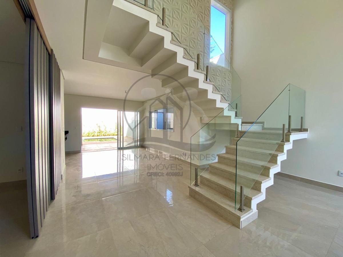 Escada em mármore com guarda corpo em vidro Piso térreo: Ambientes integradosSalas de estar, jantar, Sala Home com painel de comando em madeira ripada, podendo inverter para uma ampla suite, 1 LavaboCozinha americana com bancada em granito São Gabriel, armários, cooktop, coifaÁrea de serviço ampla, rica em planejadas , privativa com entrada independenteBanheiro externo de apoio a area gourmet, com box, pia com gabinete